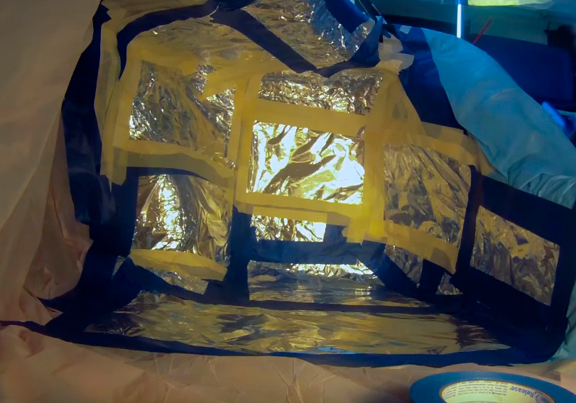 Then, on top of the masking tape, apply a thick layer of foil. Before you begin glassing, it’s also a good idea to lay down something like newspapers all around the work area.